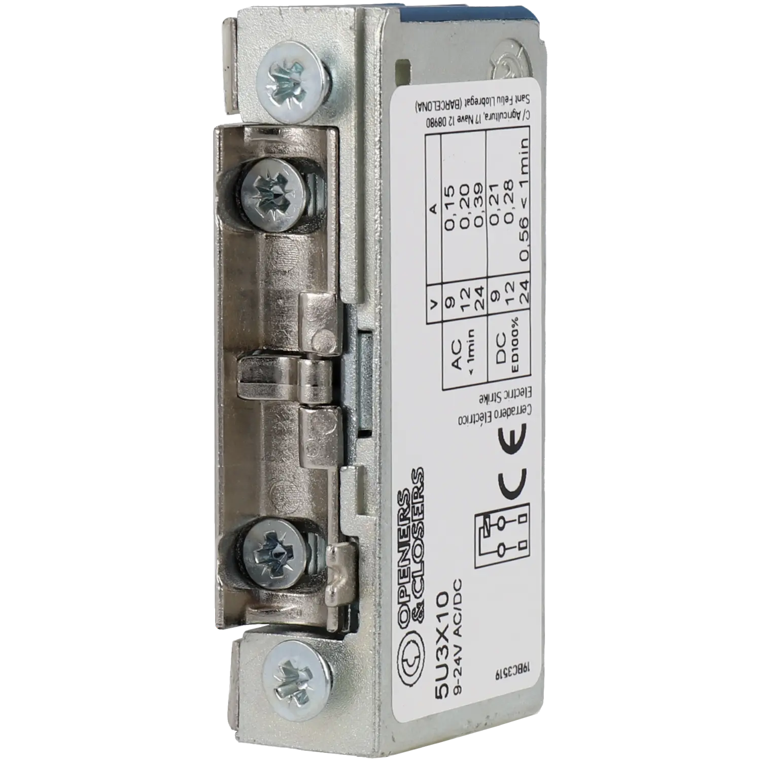 • Propriedades: Resistencia de cierre: 490 Kg; Fuerza dinámica de cierre: 449 Kg; Durabilidad garantizada: 200000 ciclos; Pestillo: Ajustable de zamak; Profundidad de pestillo: 6 mm; Ajuste de pestillo de mínimo a máximo: 7.1 ~ 10.1 mm; Tapa: Inox; Protector de sobretensión: Sim
