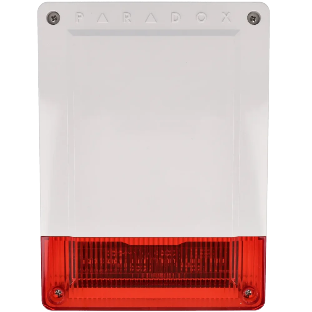 - Características técnicas: Frequência: 868 MHz; Potência: 100 dB; Tamper de caixa: Sim; Tamper de parede: Sim; Luz piscante: Sim; Tipo de notificação: Acústica e visual; Distância transmissão RF: 70 m; Compatibilidade: Centrais Paradox; Tempo para disparo do alarme: 4 seg; Duração aviso acústico: Até 4 minutos; Indicador LED: Sí