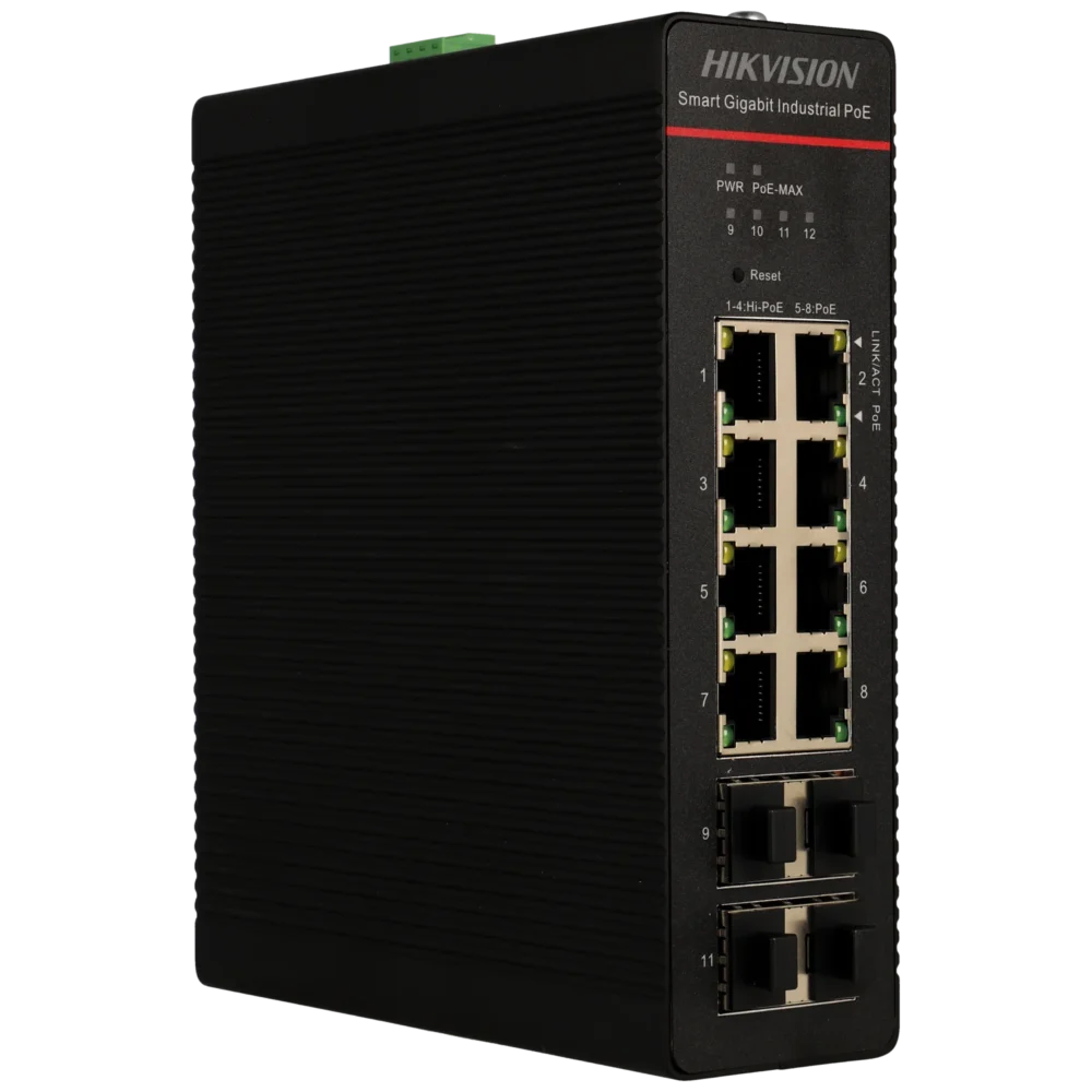 • Gestão remota: P2P: Sim; Software: Hik Partner Pro; Reiniciar switch: Sim; Reinicialização da porta PoE: Sim; Ativação do modo estendido: Sim, independentemente por porta; Modificação da velocidade da porta: Sim; Consumo real de potência: Sim, total e por porto; Histórico de picos de consumo: Sim (até 7 dias); Informações de trânsito em tempo real: Sim, por porto; Informações sobre o dispositivo conectado: Sim, para equipamentos Hikvision (IP, modelo e SN); Diagrama de topologia automático: Sim, para dispositivos Hikvision conectados