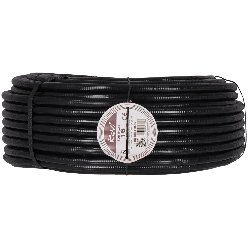 • Material e dimensões: Material: Doble capa: PVC rígido corrugado (interior) / PVC flexible (exterior); Peso líquido: 4500 g; Comprimento: 100 m; Cor: Preto; Diámetro: 16 mm