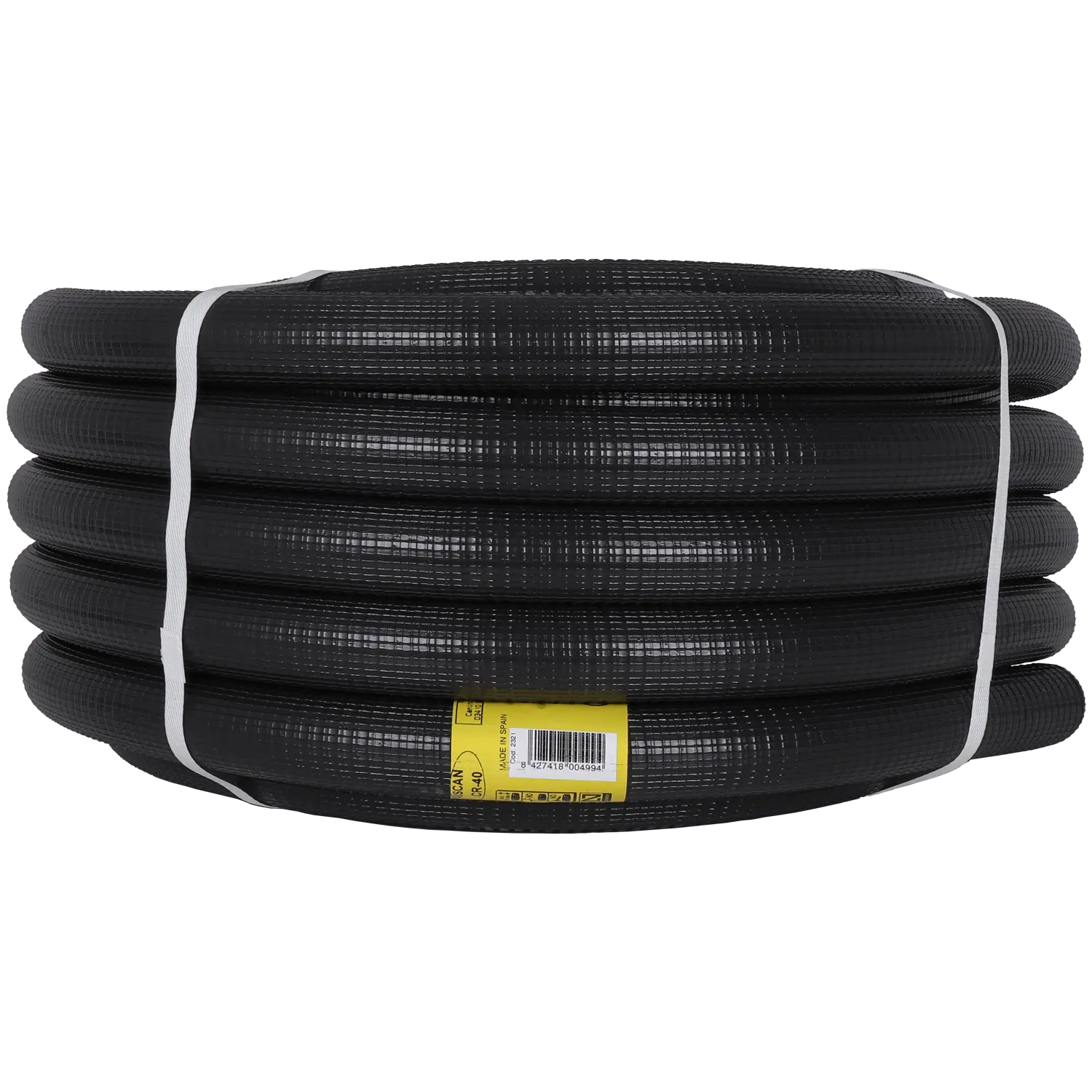 - Material e dimensões: Material: Doble capa: PVC rígido corrugado (interior) / PVC flexible (exterior); Peso líquido: 3400 g; Comprimento: 25 m; Cor: Preto; Diámetro: 40 mm